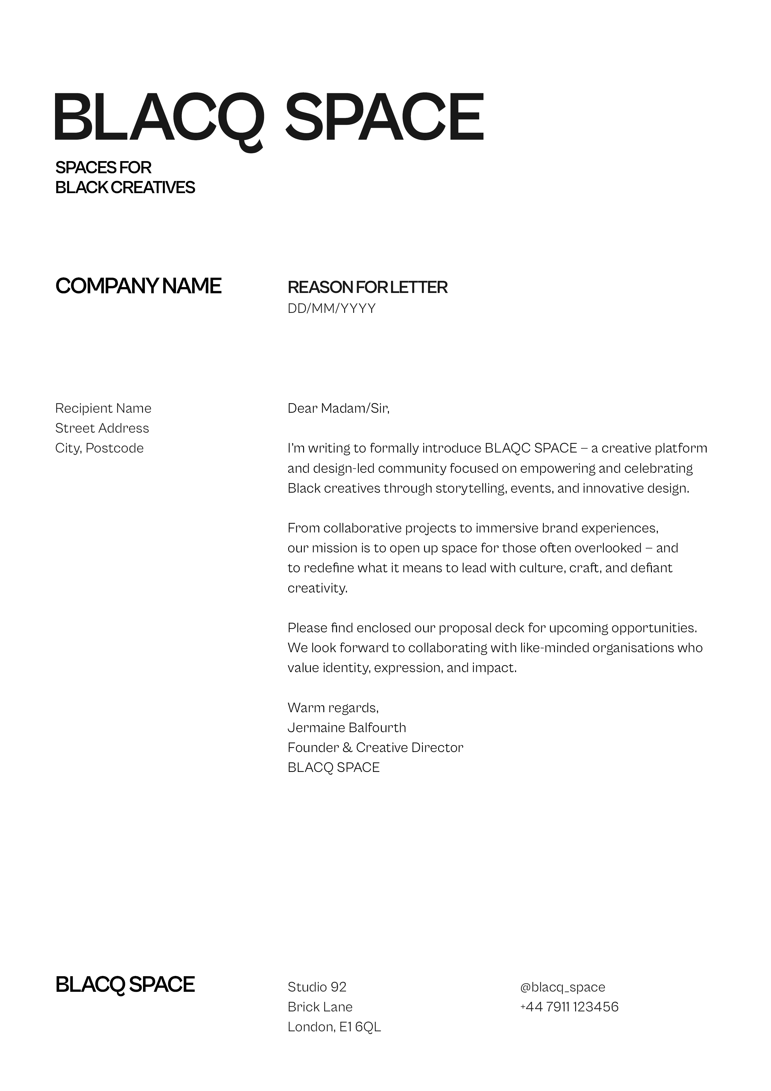 The visual language of Blacq Space is built around tension and balance. Strong typographic weight, minimal colour restraint, and raw compositional layouts work together to create a system that feels assertive but considered. Nothing exists purely for decoration; each element serves clarity, hierarchy, and impact. Blacq Space is built for a youthful Black audience that values visibility, expression, and cultural energy. Vibrancy is intentional, not accidental. However, the visual system is deliberately restrained to ensure the brand can exist beyond expressive moments alone. By controlling colour usage, typographic hierarchy, and composition, the identity remains adaptable across both informal and formal contexts. This balance allows Blacq Space to operate confidently within creative, cultural, and institutional environments without losing its voice. Expression is present, but discipline ensures longevity.